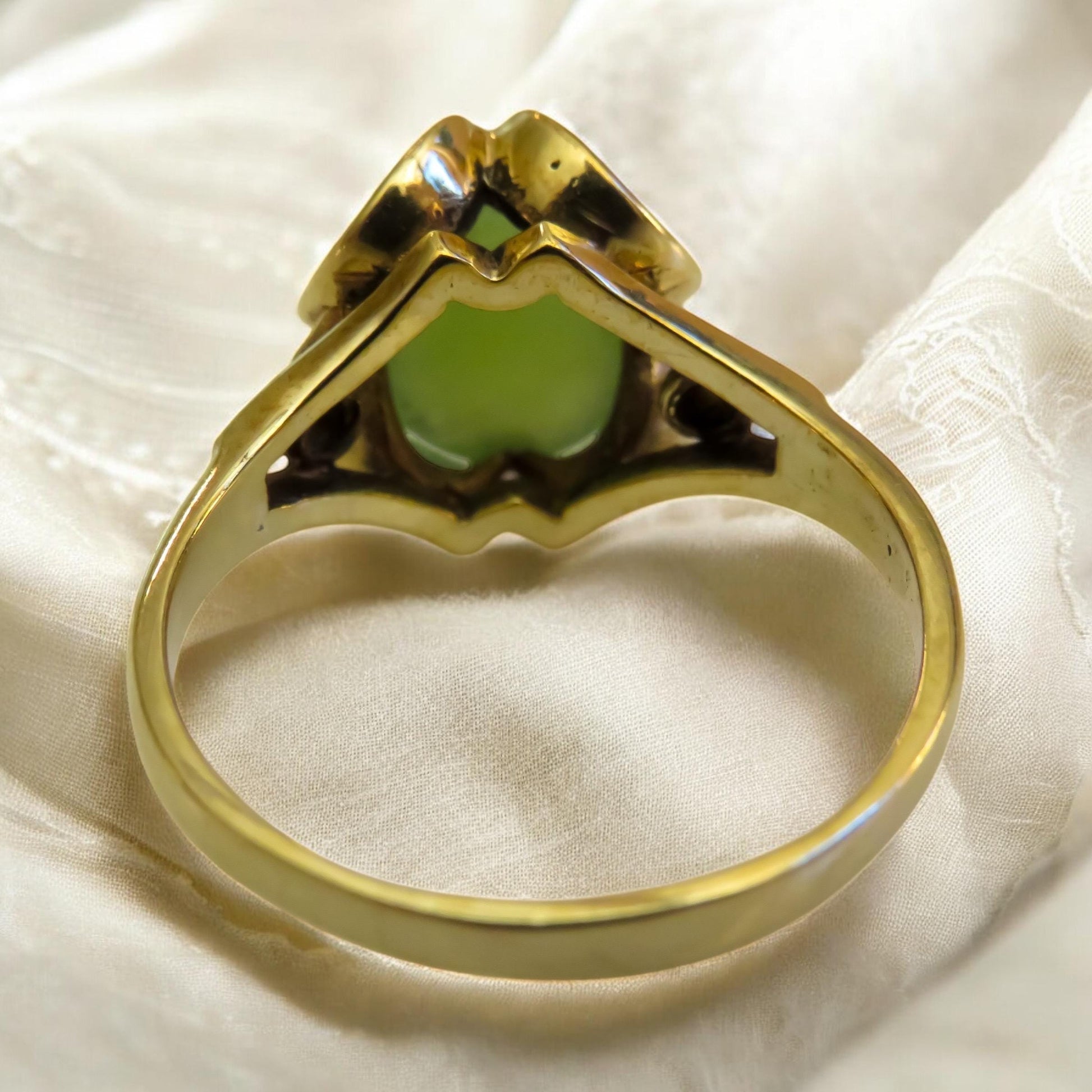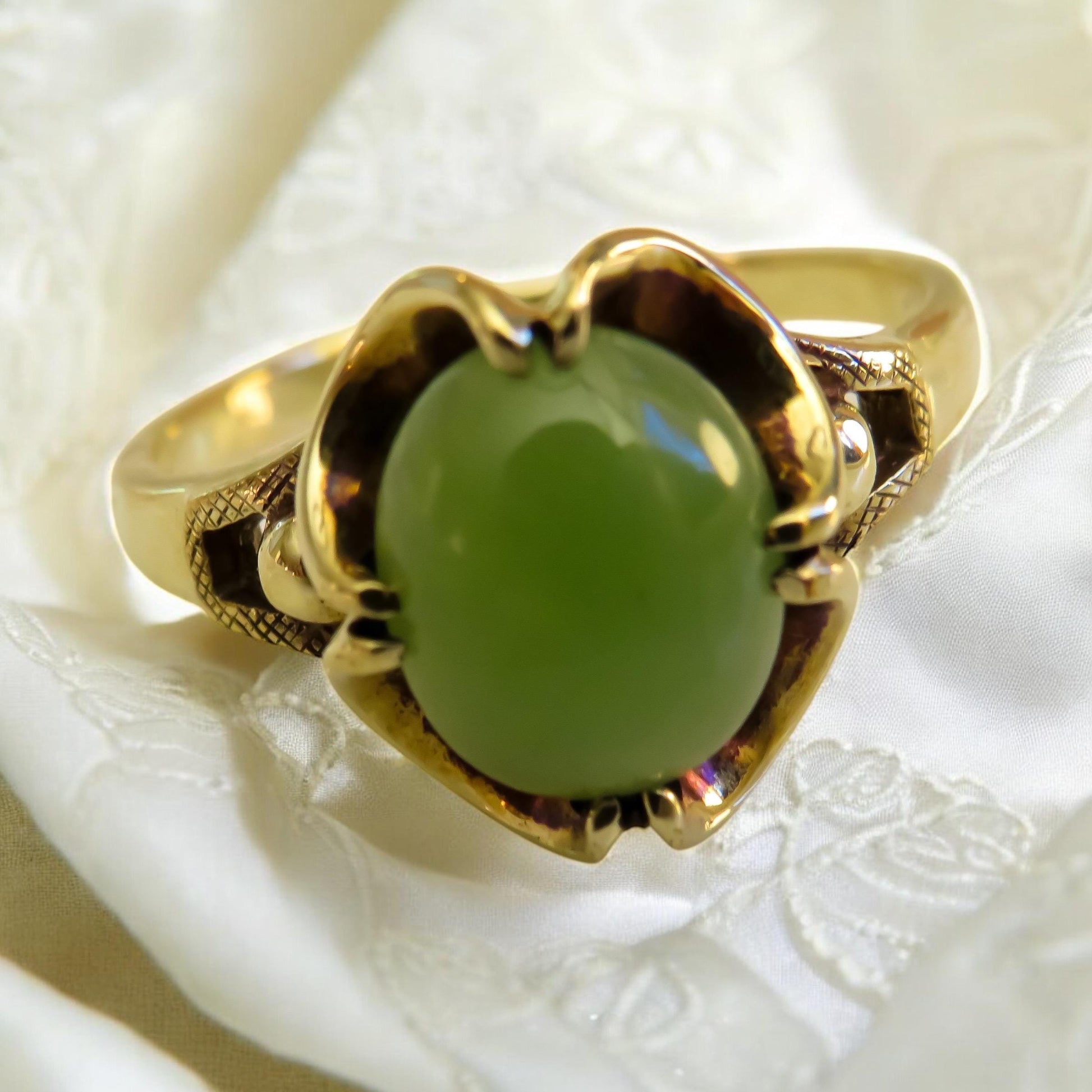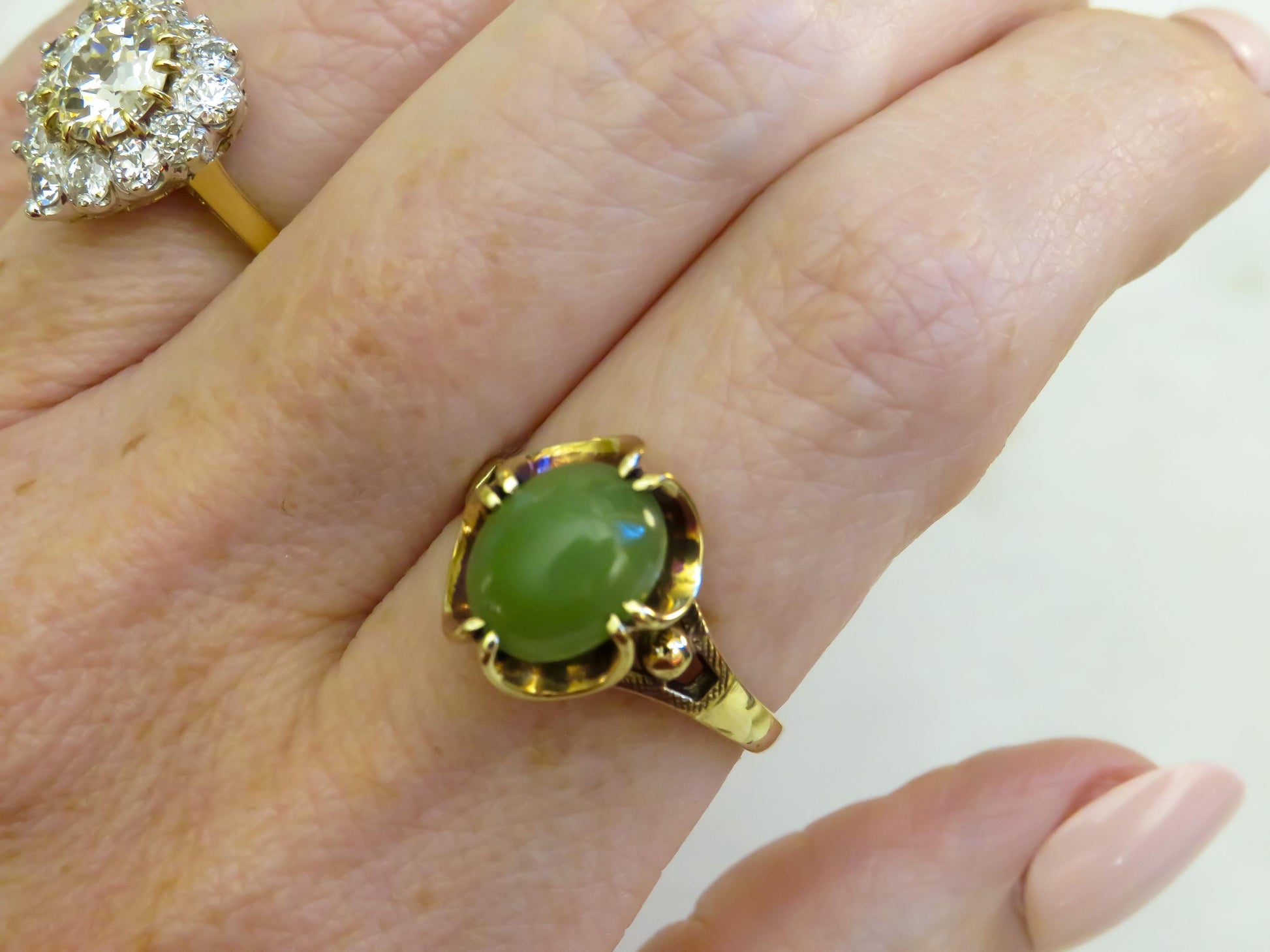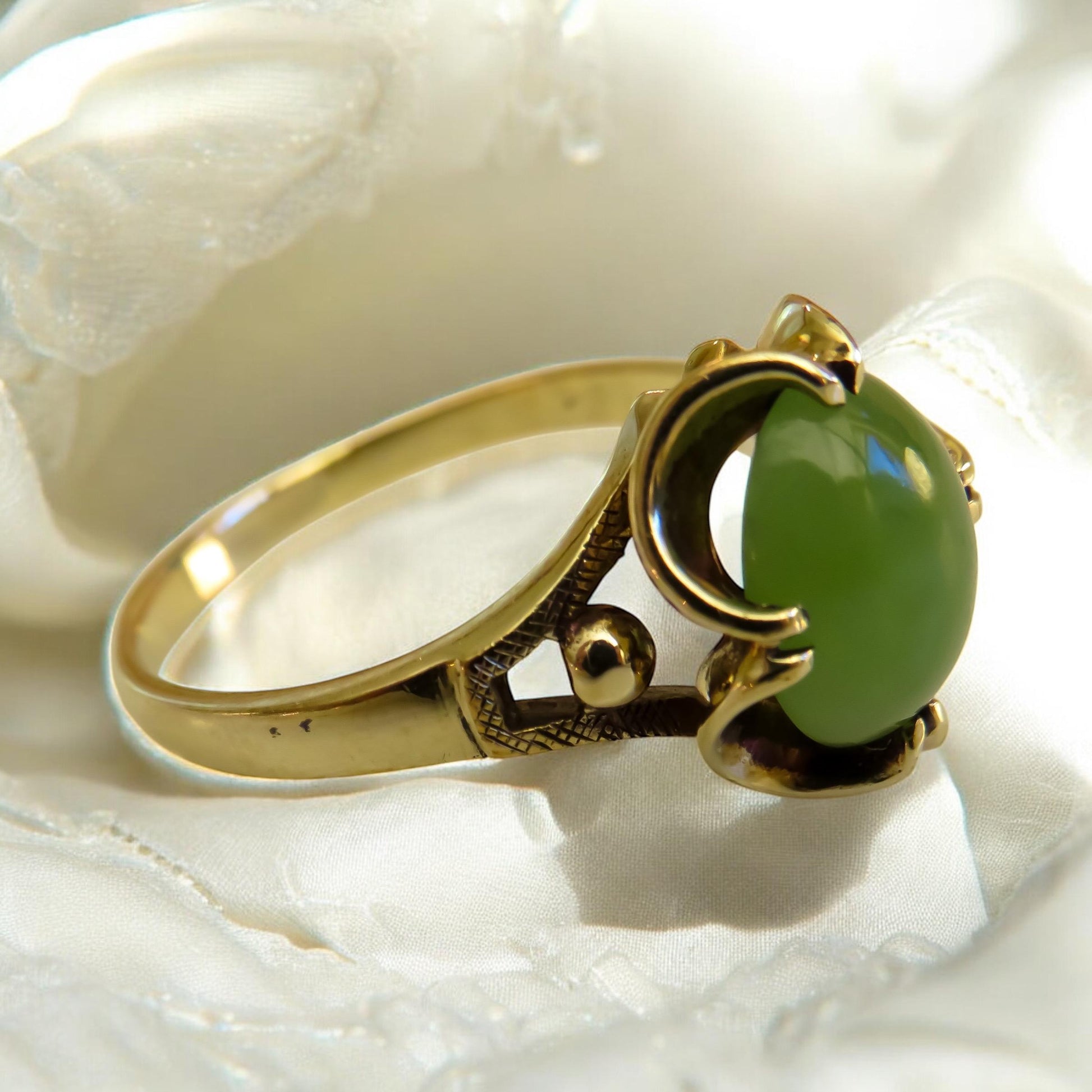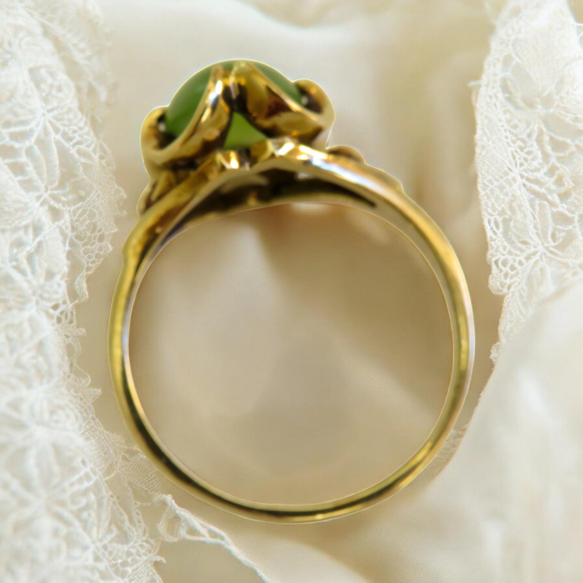 Victorian Jade Ring | Size 8 | 10K Gold | Antique Green Jade Cabochon Ring | Ornate Filigree Setting | Heirloom Jewelry