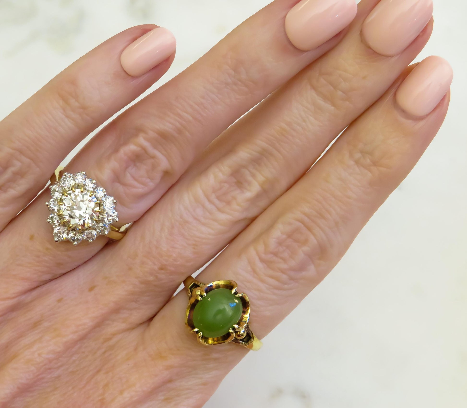 A true relic of romance and refinement, this antique jade ring captures the timeless beauty of the Victorian era. Set in luminous 10K yellow gold, the design features a glowing green jade cabochon nestled within an ornate crescent-prong settingan elegant nod to Victorian symbolism and sentimentality.