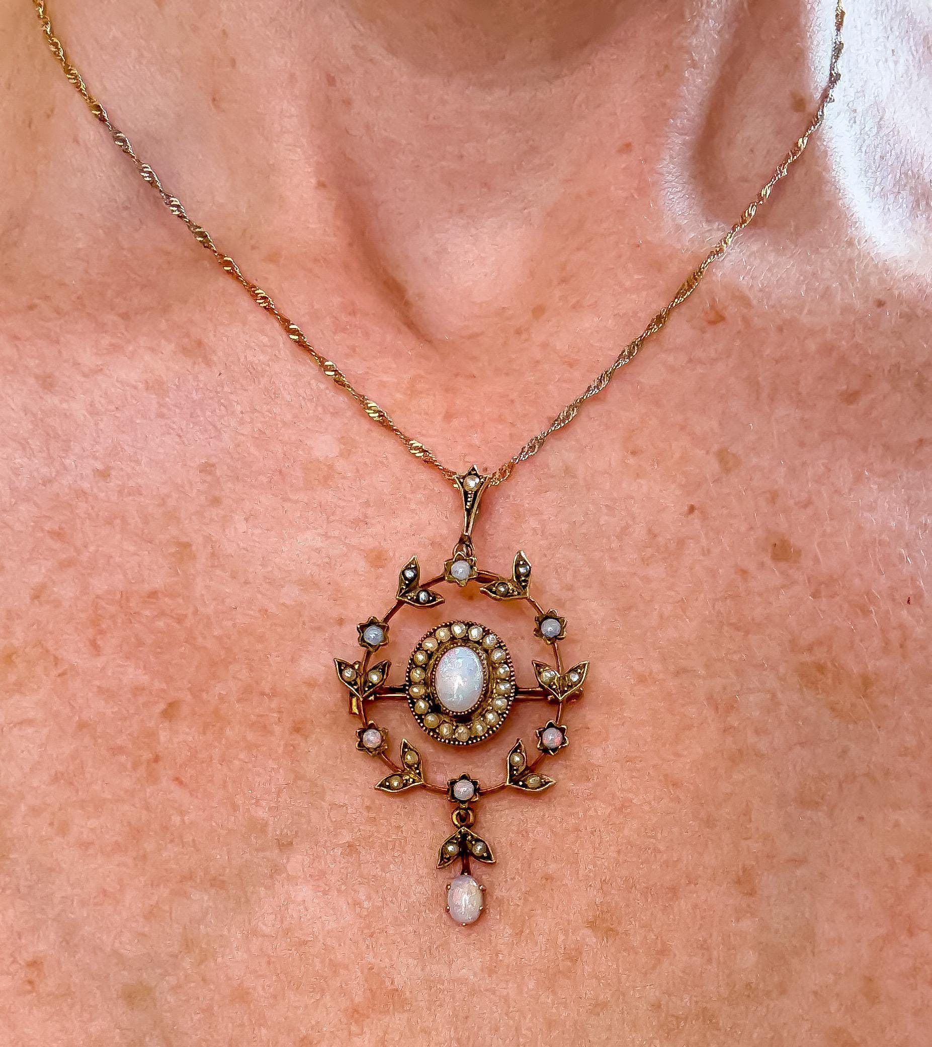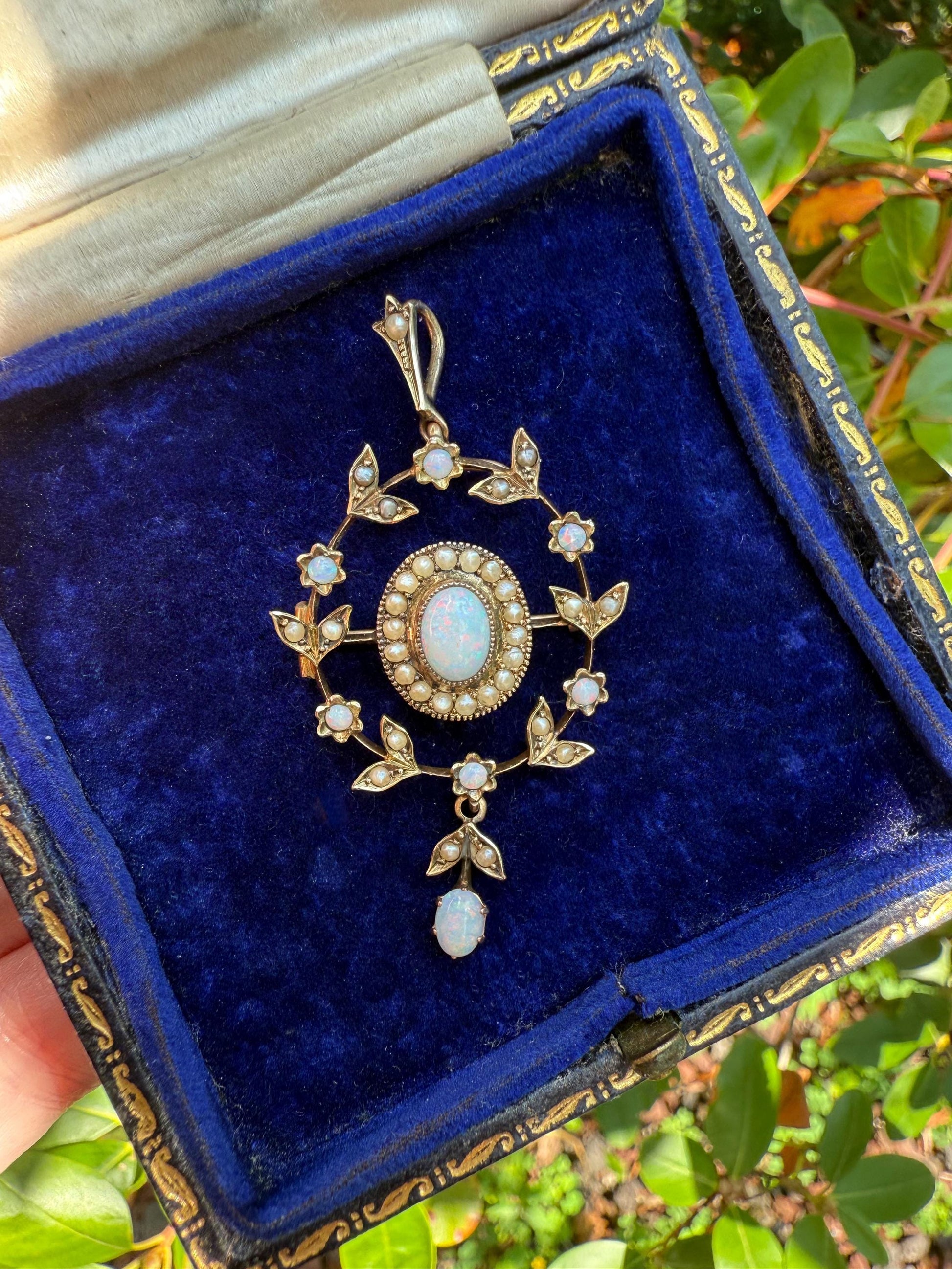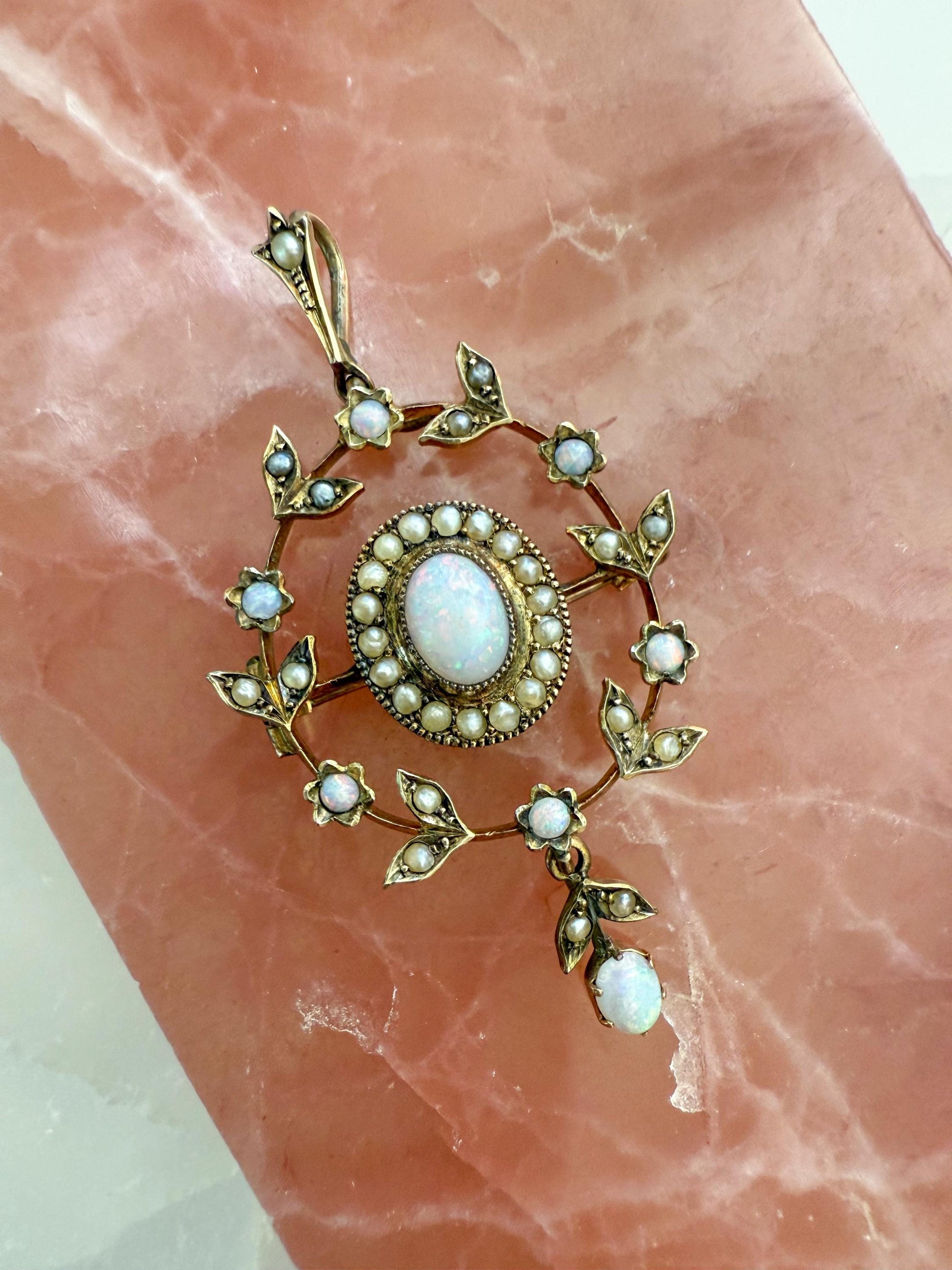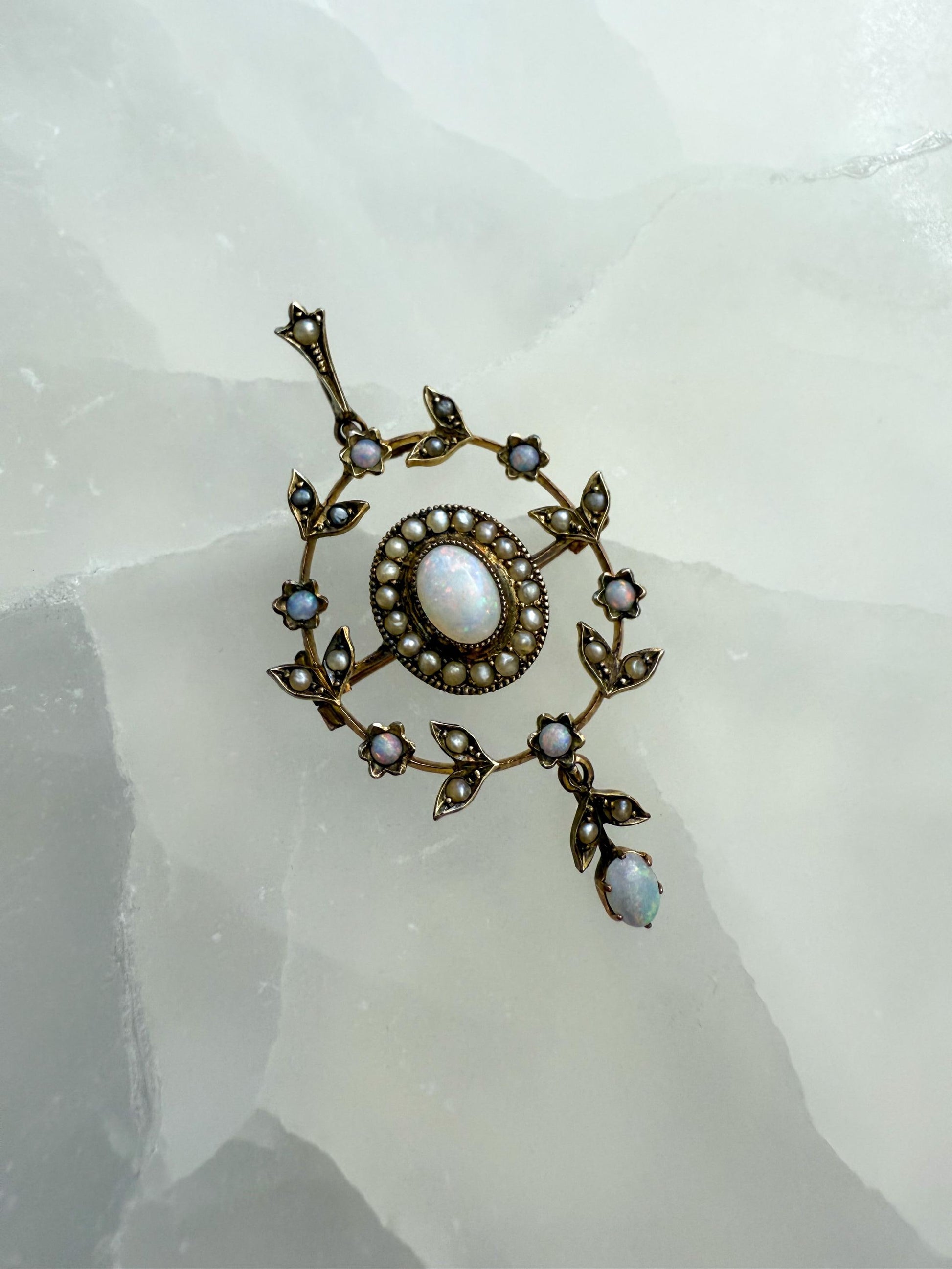 At the center sits a glowing cabochon opal, encircled by a delicate halo of seed pearls. More opals and pearls are thoughtfully arranged throughout the design, evoking blooming flowers and leafy sprays. A single opal drop gently dangles from the base, adding graceful movement to this enchanting piece.