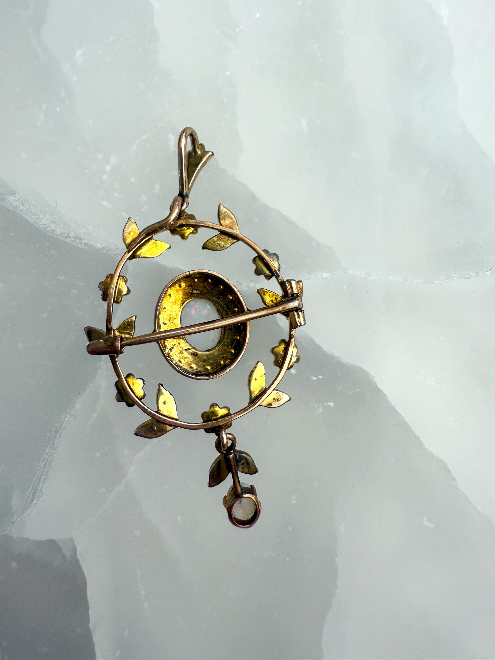 Victorian Natural Opal & Seed Pearl Pendant Brooch | Antique 14K Gold Floral Design | Convertible Brooch Pendant