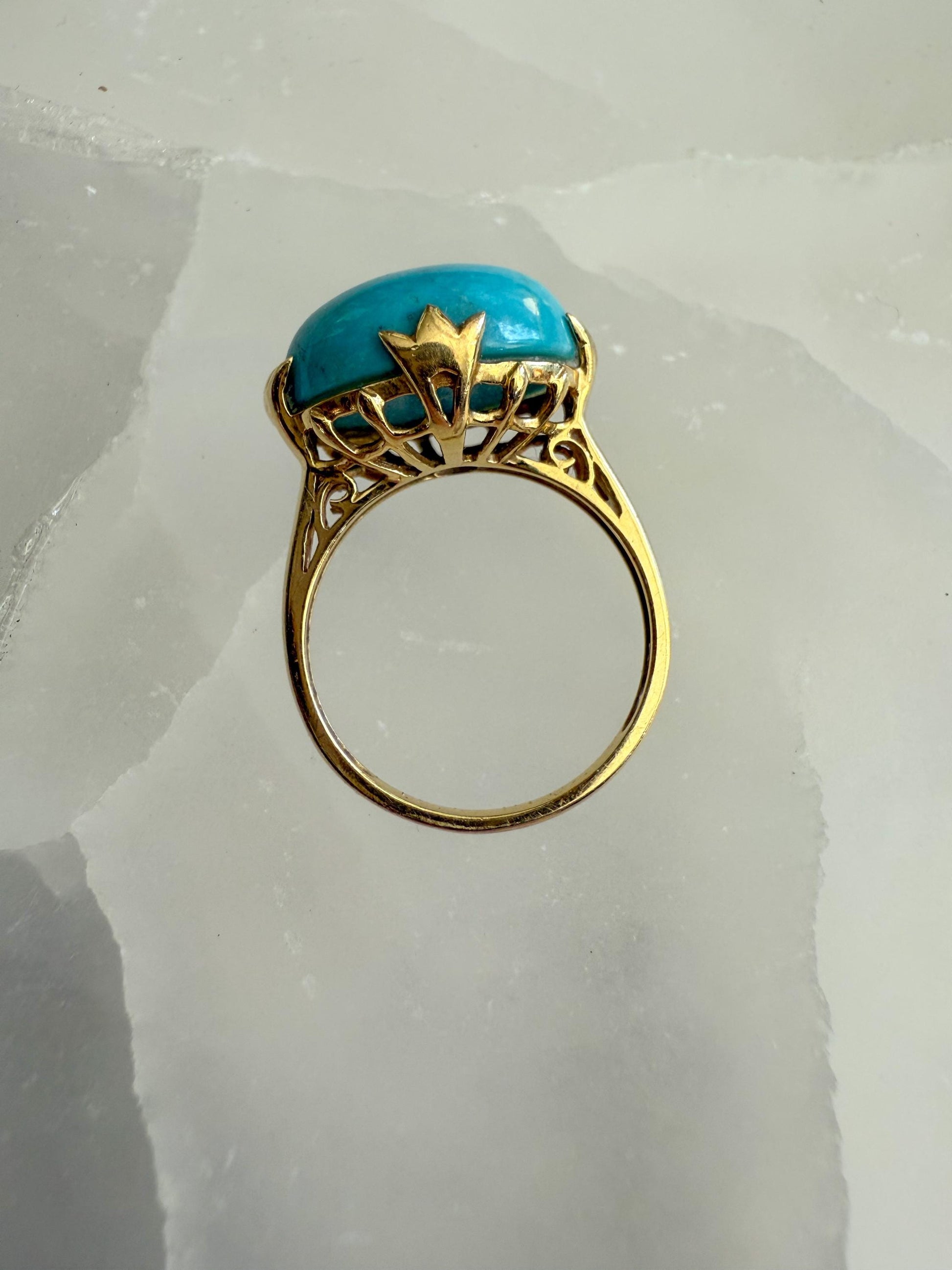 A timeless vintage treasure, this ring features a bold, oval-shaped turquoise cabochon set in warm 14K yellow gold. The vibrant turquoise stone, measuring 11.5mm x 16mm, has a smooth cabochon cut that highlights its natural beauty and eye-catching presence.