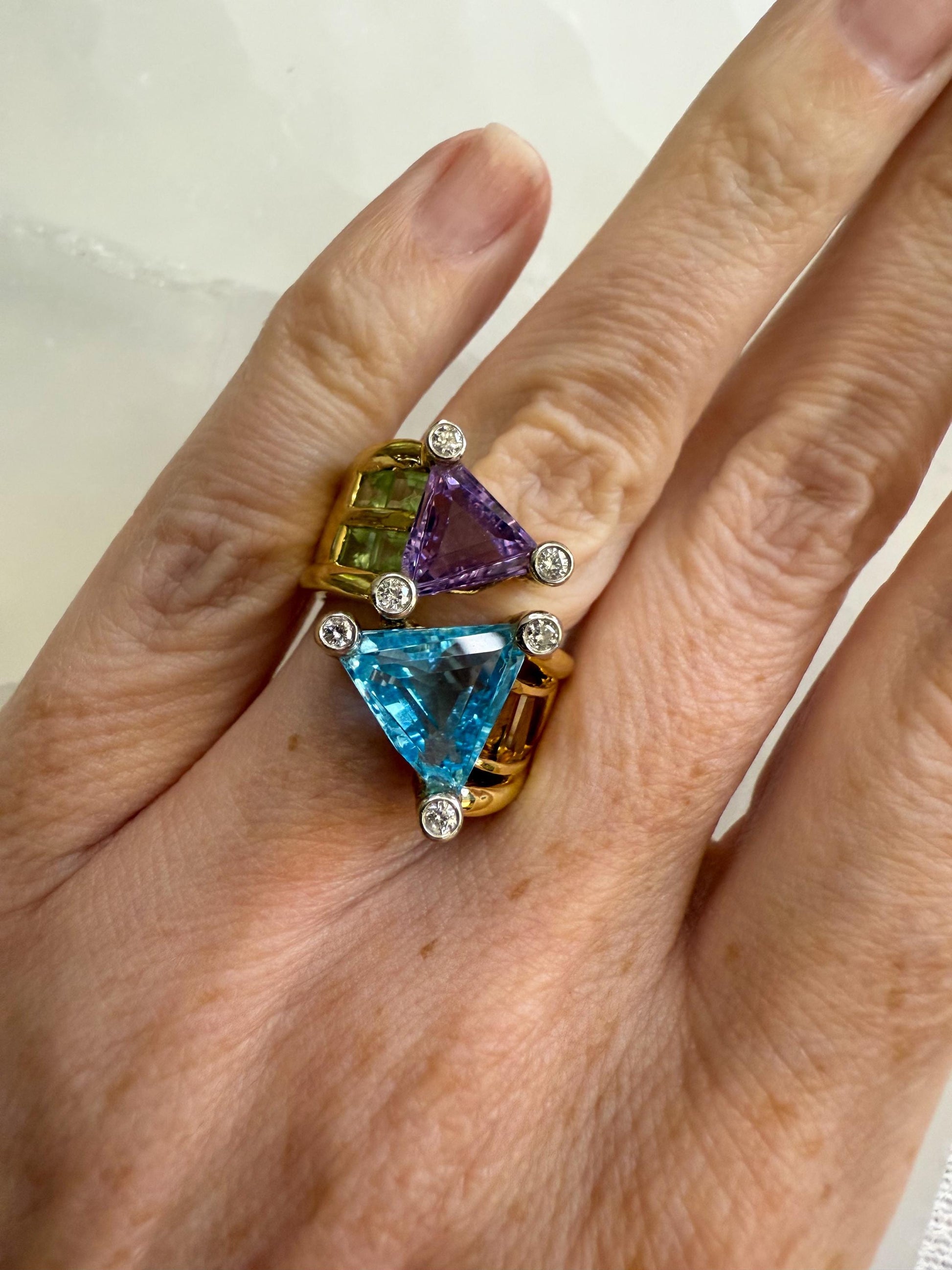 Bold, colorful, and absolutely dazzling – this vintage cocktail ring is a true statement piece. Crafted in rich 18K yellow gold, it showcases a striking mix of gemstones: a vibrant blue topaz, a royal purple amethyst, golden citrine, and fresh green peridot. Each stone is beautifully cut and accented with sparkling round diamonds, adding just the right touch of brilliance.