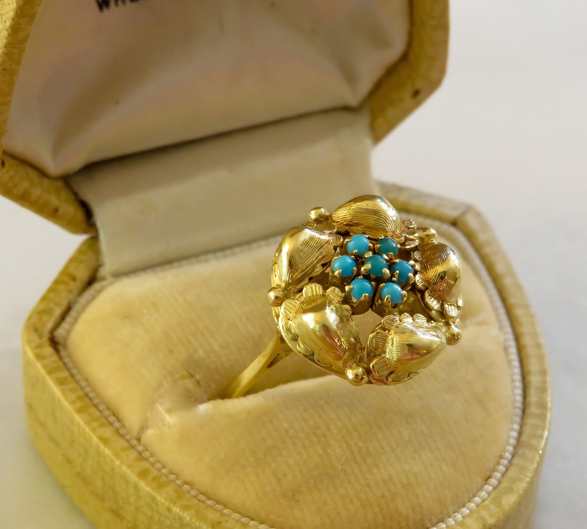 In the center is a beautiful nest of prong-set cabachon turquoise stones.