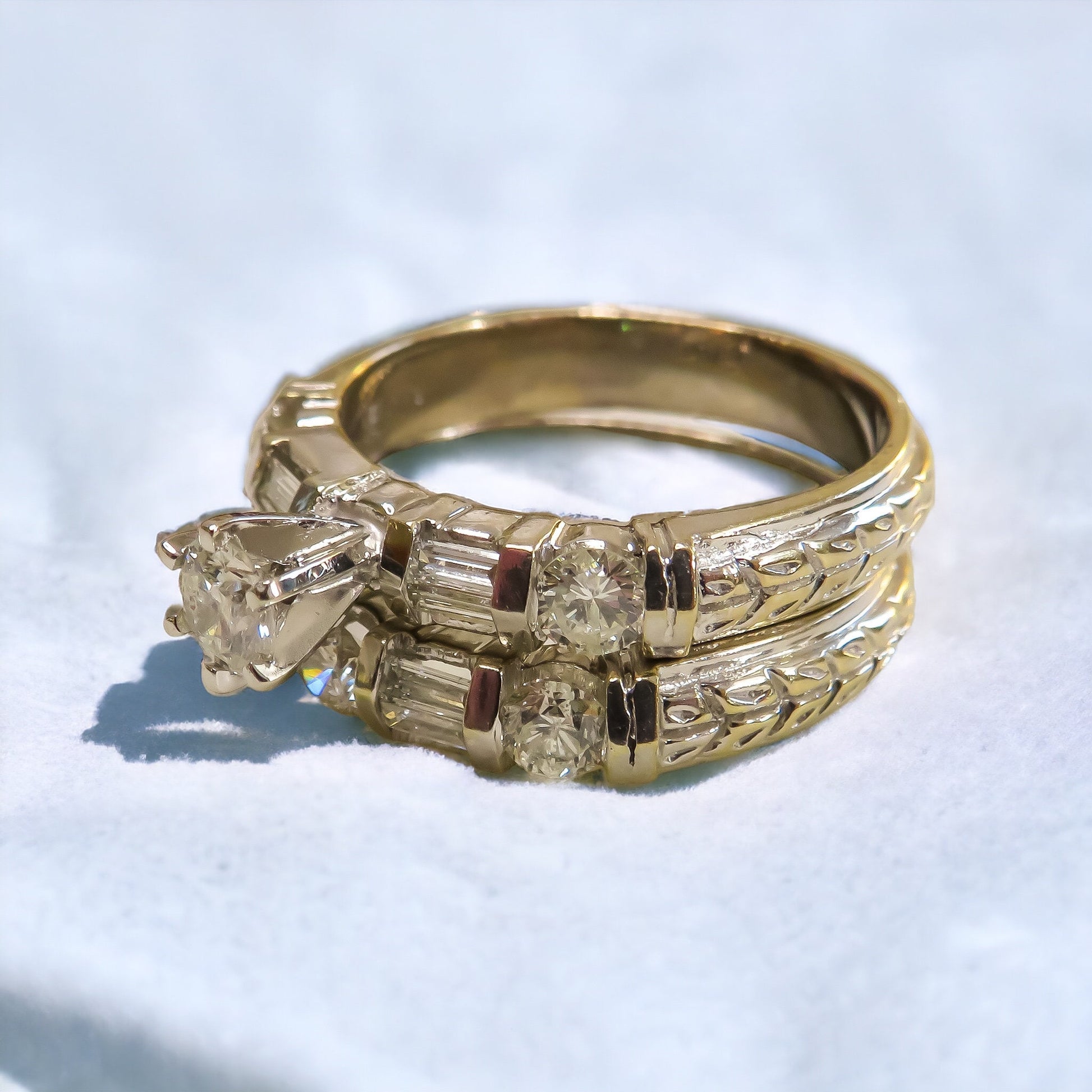 The engagement ring and wedding band feature a captivating blend of round and baguette diamonds, totaling approximately 1.10 carats.