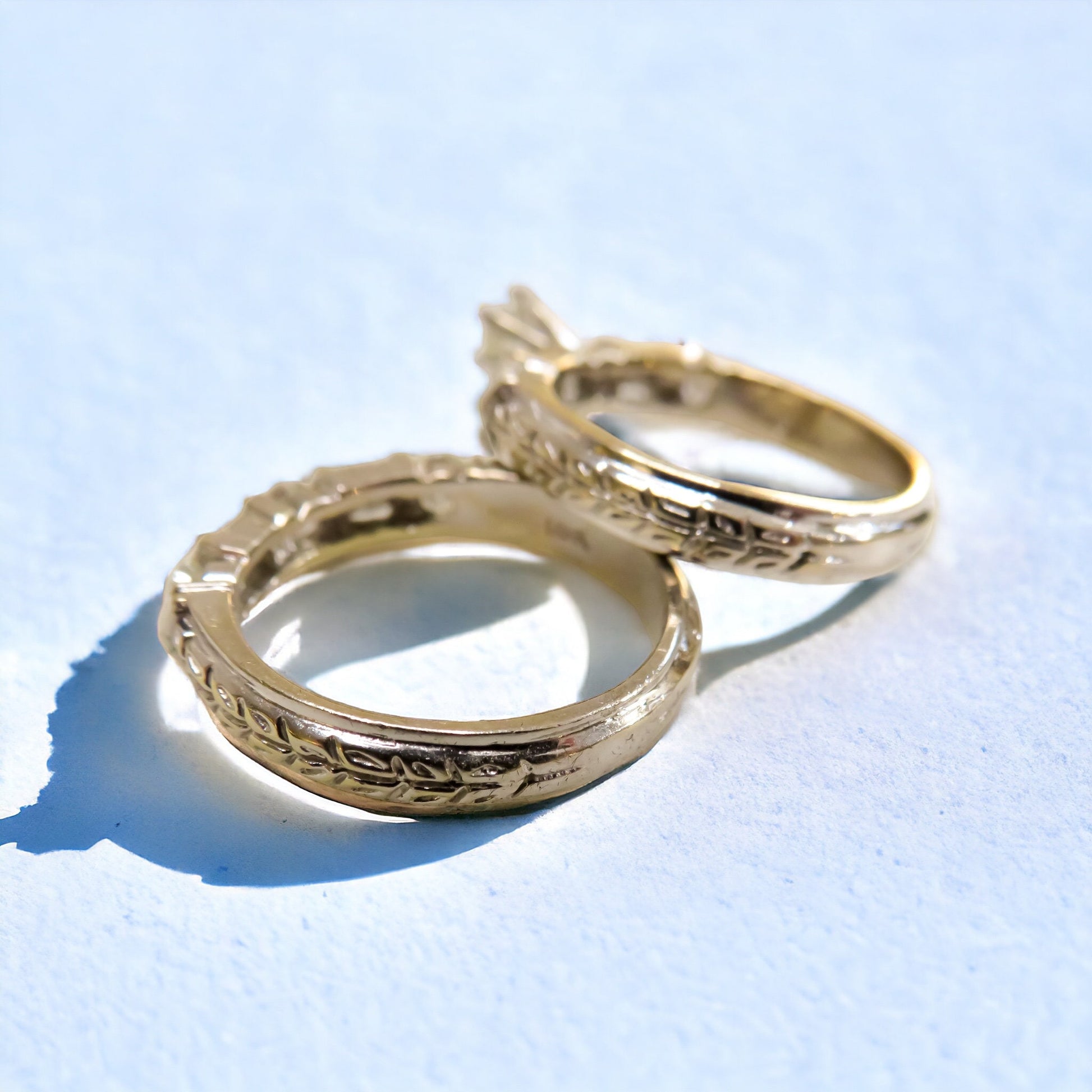 This set is a celebration of timeless elegance and intricate craftsmanship, with engraved bands adding a touch of vintage charm.