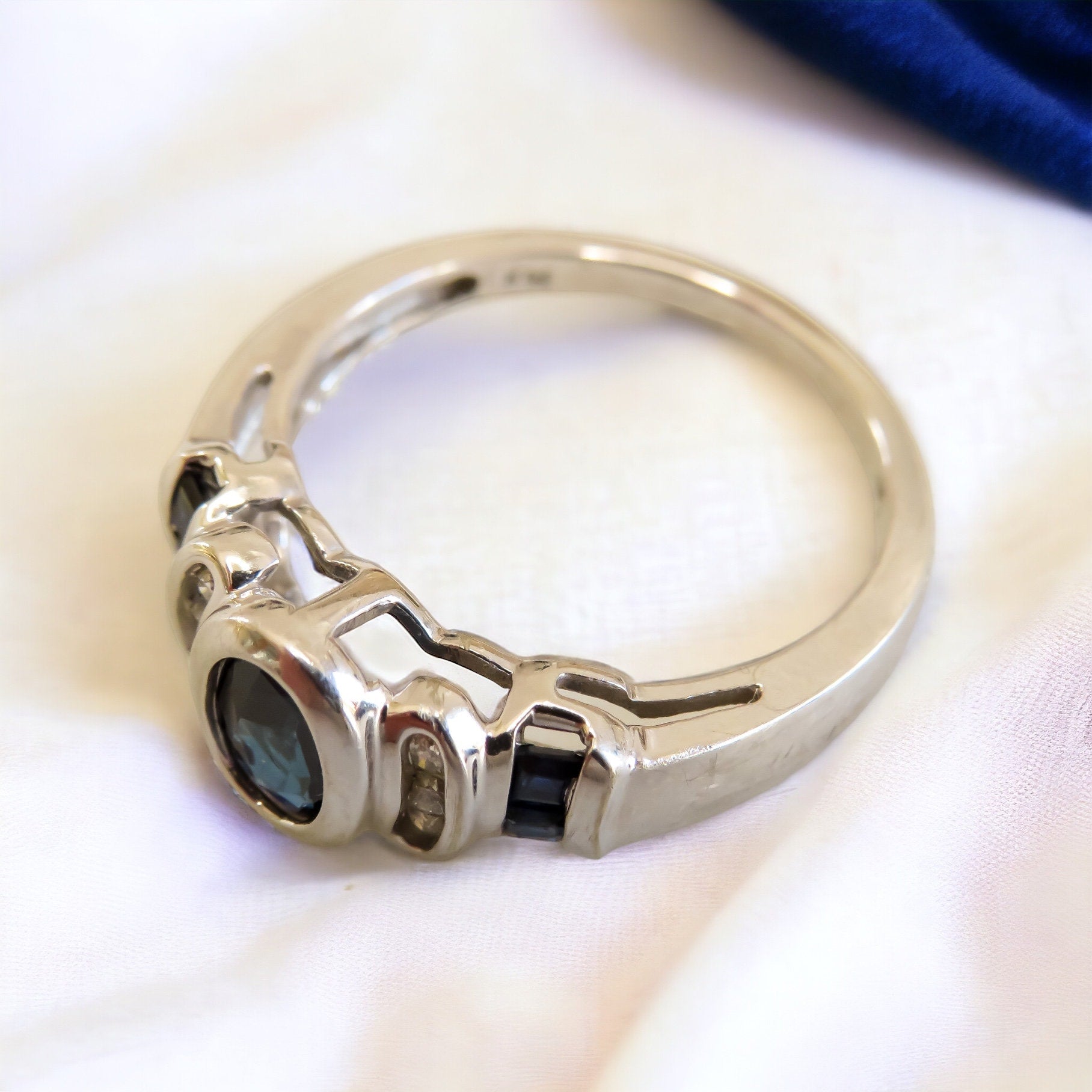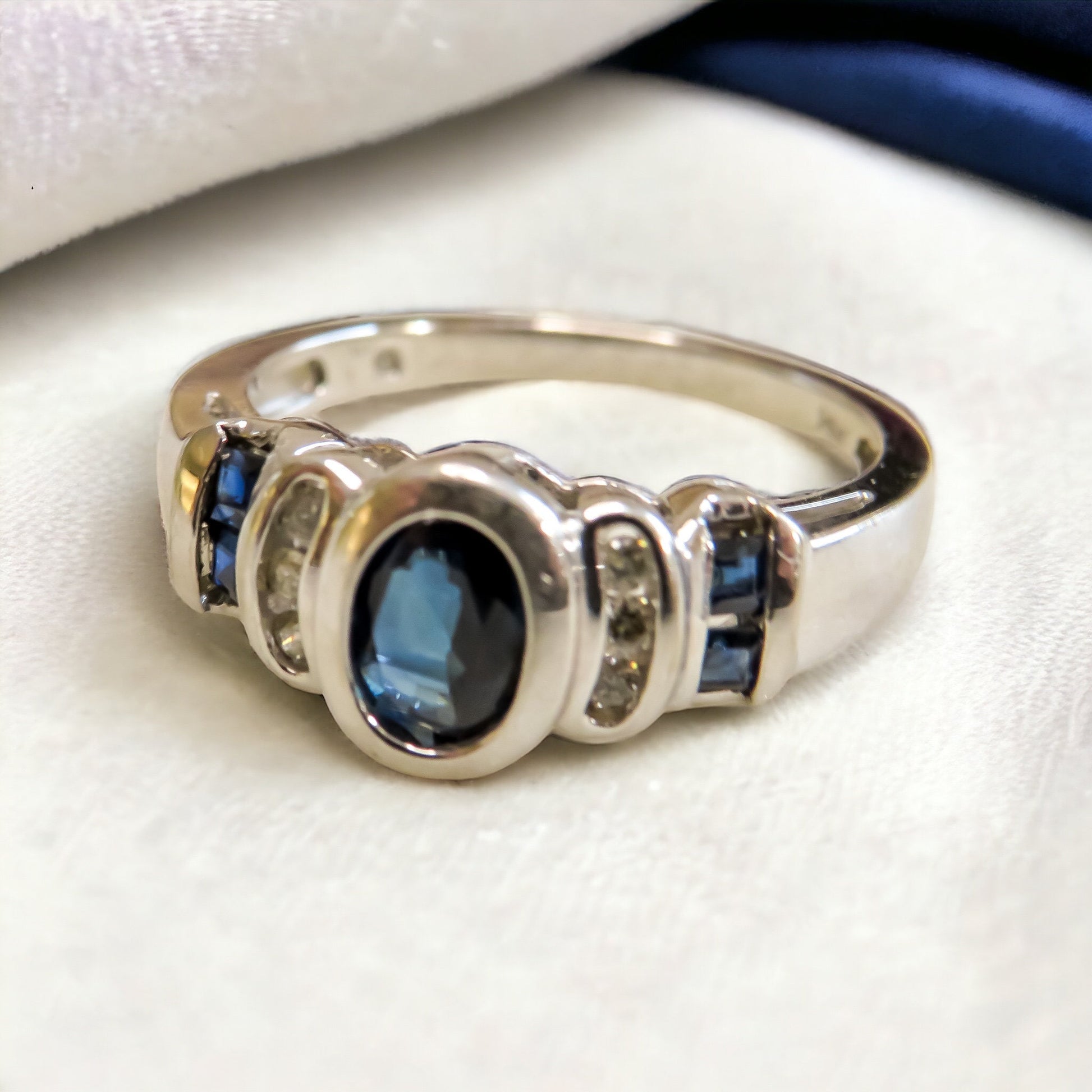 Introducing our exquisite Estate Sapphire Ring, a timeless blend of sophistication and elegance. This captivating piece features a dazzling oval-cut central sapphire, artfully bezel-set in lustrous 14K White Gold. Adorning either side are meticulously arranged French-cut sapphires, enhancing the ring's allure with their deep, velvety blue hue.