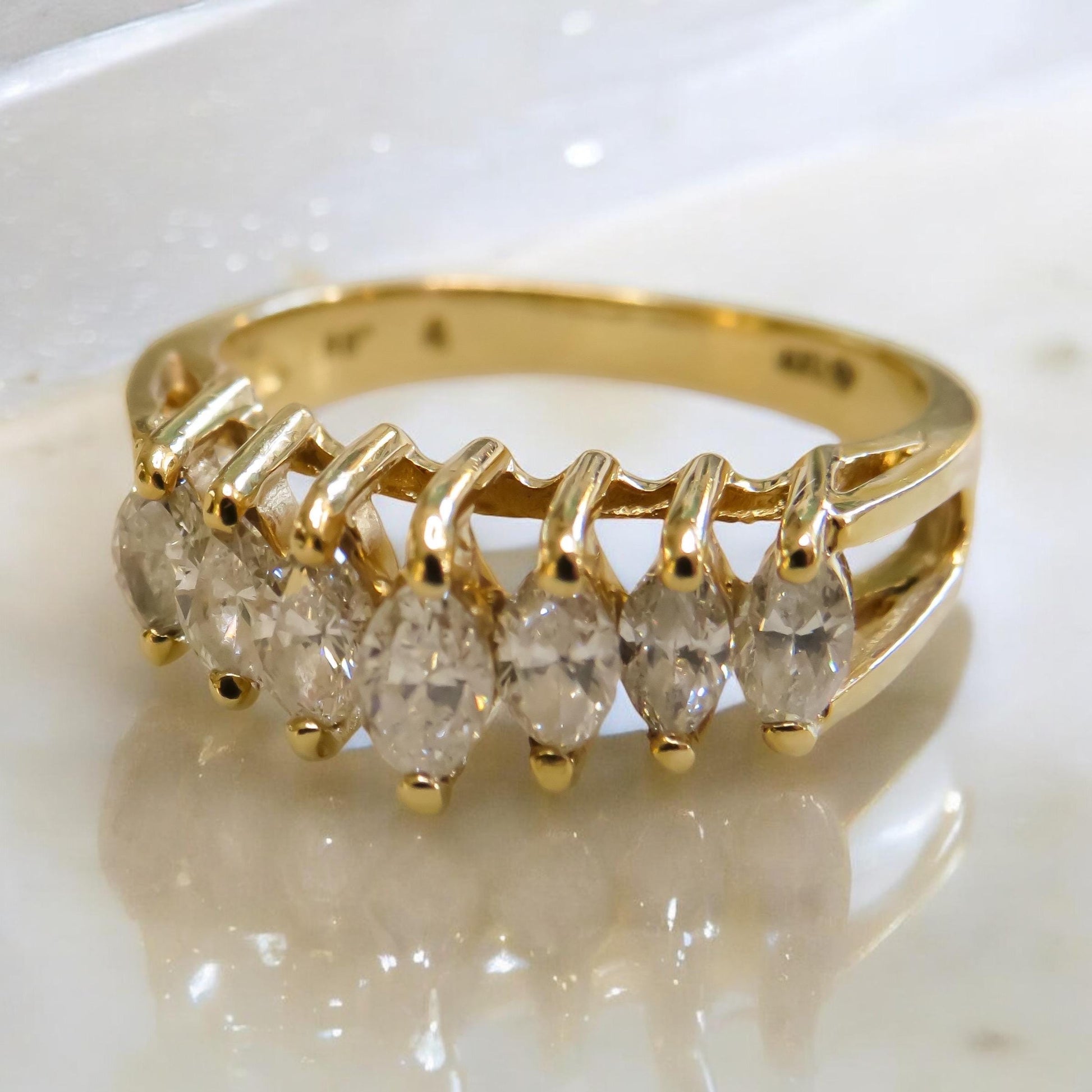 Featuring a row of seven brilliant marquise-cut diamonds, this ring exudes refined elegance. The elongated marquise shape offers a flattering, graceful silhouette, accentuating the hand with its sophisticated sparkle.