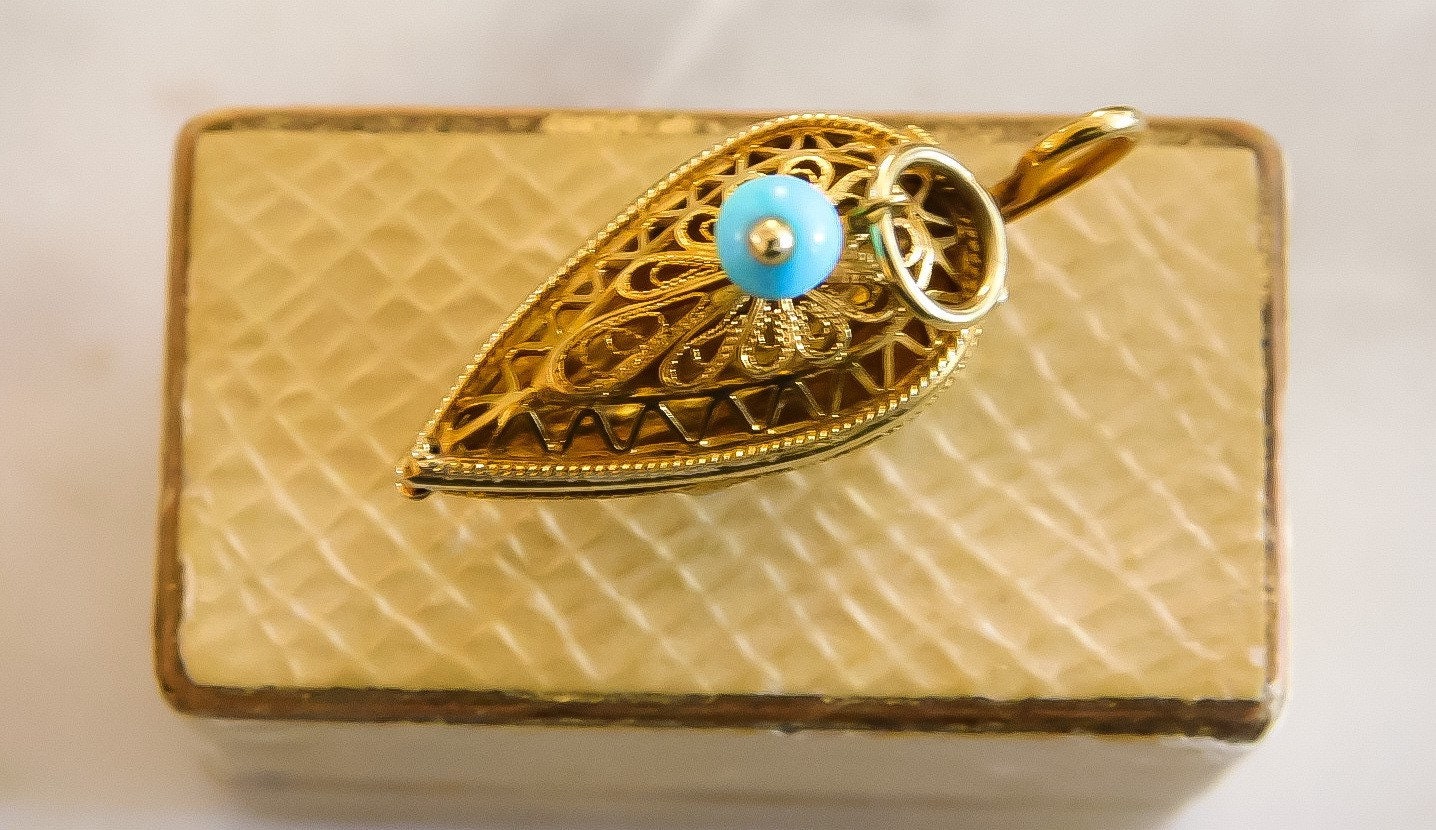 Vintage Oil Lamp Vinaigrette Charm 14K Yellow Gold and Turquoise